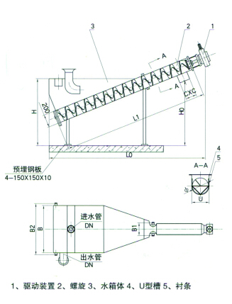 利用螺旋旋轉(zhuǎn)的軸向推移,將砂逐漸推至出口處,掉入車中,完成砂 水分離過程。螺旋砂水分離器主要由驅(qū)動裝置、U形槽、螺旋體、水 箱、襯條等組成。